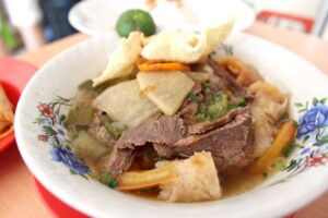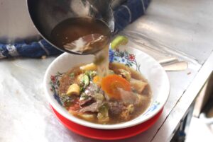 Tidak hanya Soto Mie, yang spesial di sini adalah Soto Daging dengan isian daging sapi, risol, tomat, tanpa mie dan diguyur kuah kaldu nan lezat! Seporsinya Rp30.000.